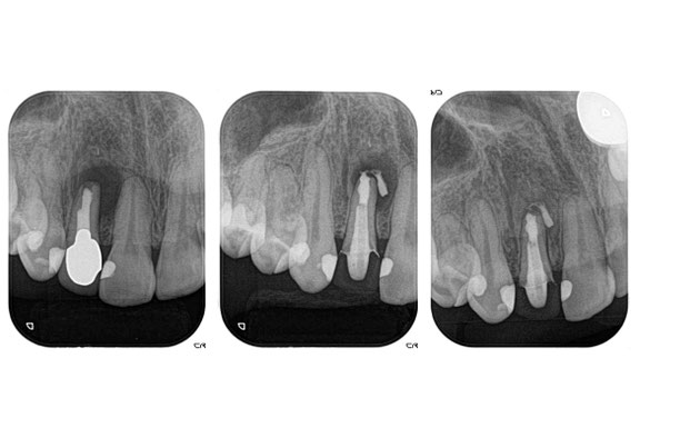 中央の写真:根管治療を行った後の状態です。内部をしっかり消毒し、MTAセメントという特殊な材料で根の先を封鎖しています。